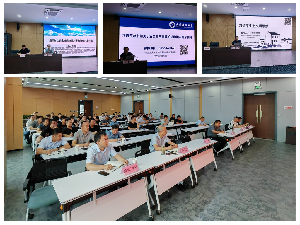 培訓邀請了安徽理工大學公共安全與應急管理學院副院長彭偉、安全科學與工程學院研究生與實驗室中心主任李重情進行授課,課程包含習近平總書記關于安全生產重要論述、習近平生態(tài)文明思想、礦山行業(yè)有關安全生產法律法規(guī)、《金屬非金屬礦山重大事故隱患判定標準》等內容。